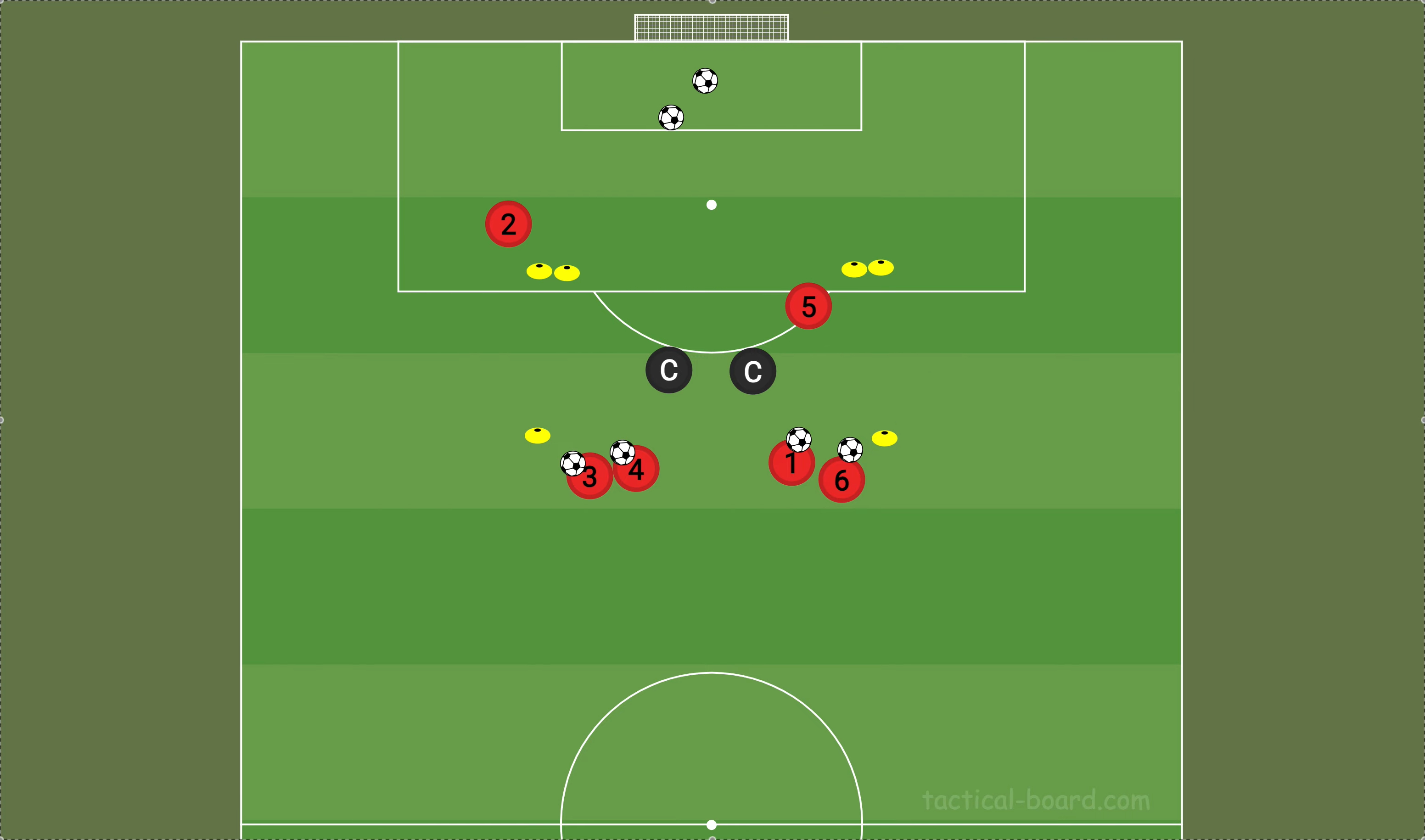 - Placera två koner bredvid varandra som en försvarare på båda sidorna av målet, strax innanför straffområdet