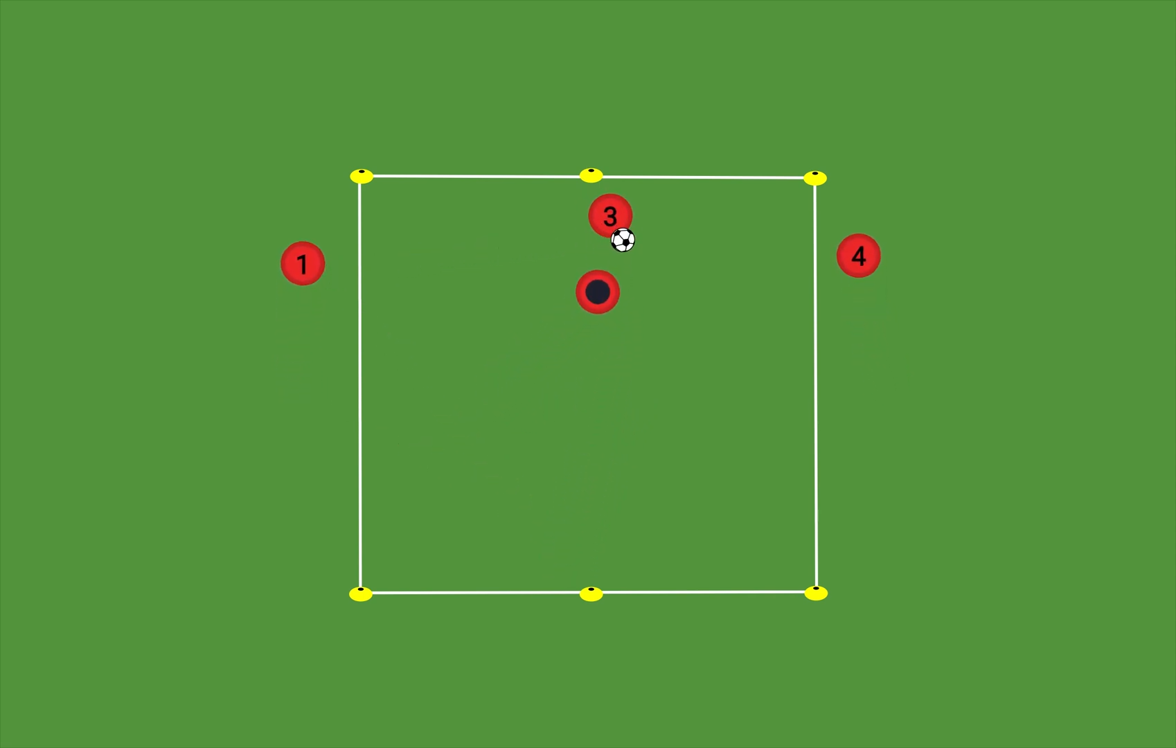 Syftet är att träna progressivt passningsspel genom en central spelyta under direkt press. Anfallarna ska genom scanning och vinklade spelavstånd hitta vägar att transportera bollen mellan kortsidorna via en central länkspelare. Försvararen ska prioritera att stänga passningskorridoren och tvinga fram felvända mottagningar eller tillbakaspel.