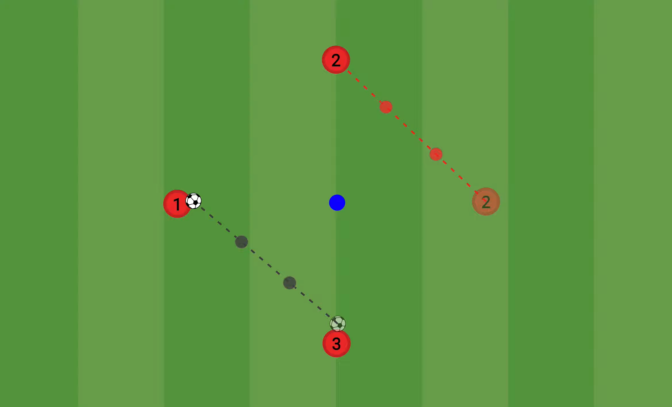 • Koner tas bort: När spelarna blivit trygga med rörelserna kan man plocka bort konerna. De måste då själva förstå och skapa trianglar genom att sina positioner och rörelser i förhållande till försvararen och de andra spelarna.